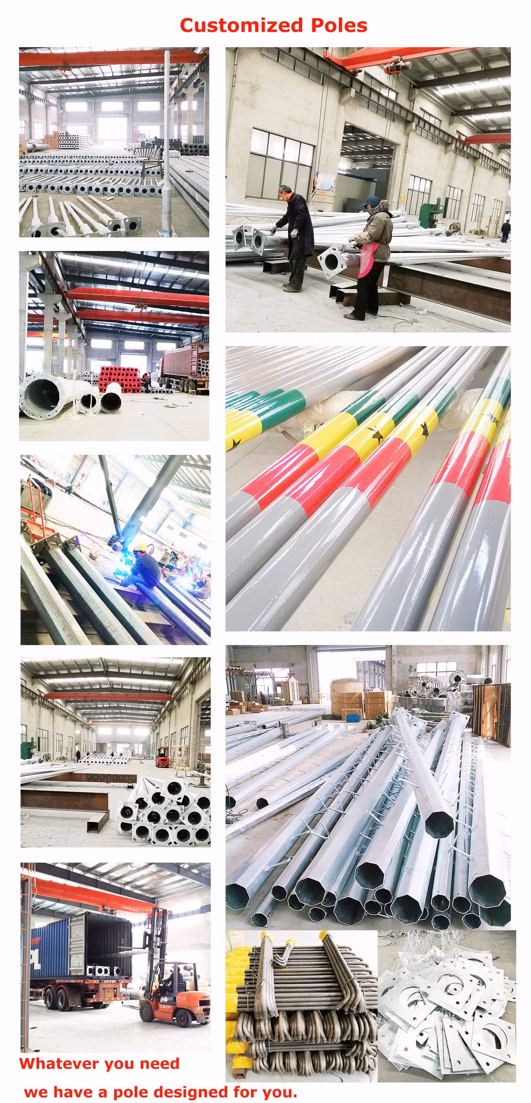 Poles for direct embedment in the ground can be provided with hot dipped galvanized base plate complete with hot dipped galvanized steel bolts and nuts. Base-mounted poles have a hot dipped galvanized flange plate that can be bolted to a foundation which is designed to withstand the forces the pole will experience in service.